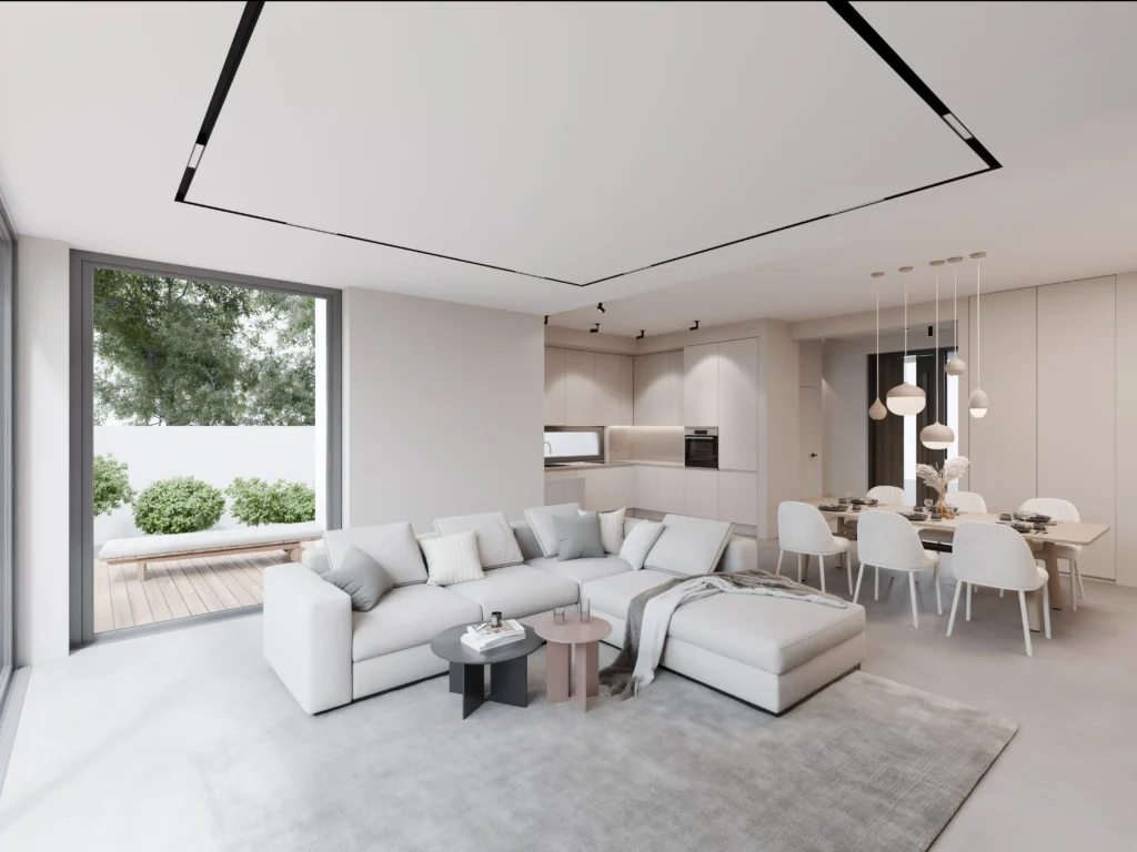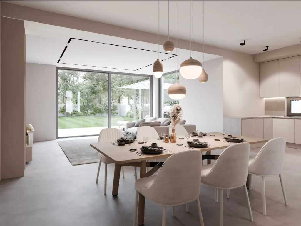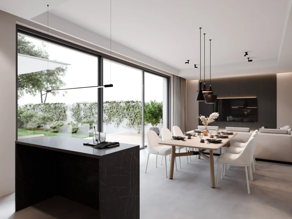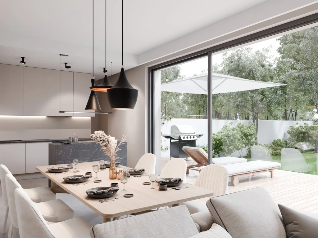 Domy zaprojektowane w idealnym układzie względem stron świata. Słoneczne tarasy od południa, imponujące przeszklenia salonu i duże okna w sypialniach sprawiają, że słońce towarzyszy Ci od poranka aż do wieczoru.